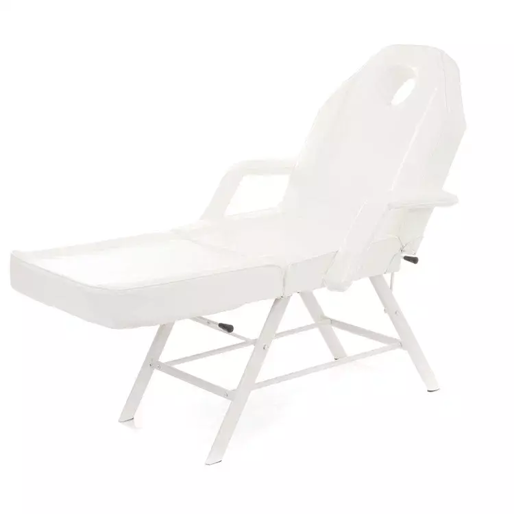 Косметологическое кресло белого цета с регулируемыми положениями спинки и икроножной секции, оснащённый гибкими самонастраивающимися подлокотниками.